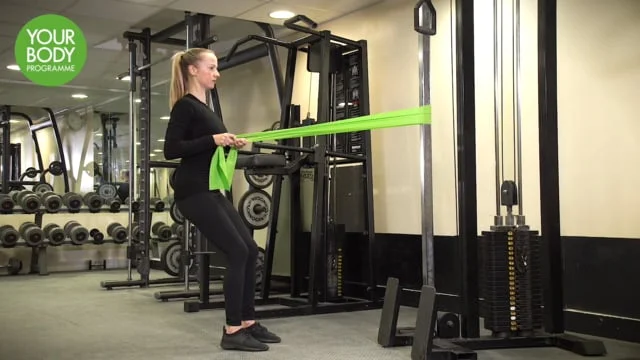 Stand in a slight squat position with your shoulders retracted, arms extended and hold the band at chest height. Pull the band towards you with your elbows close to your side. Draw your shoulder blades down and together then extend the arms.
