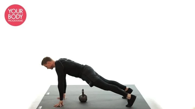 Stand feet shoulder width apart with a kettlebell placed between the feet. Bend the knees, maintain neutral spine and perform a deadlift. Place the kettlebell back onto the ground, hands onto the floor in front of you and jump the legs back into a plank position. Jump in and repeat.