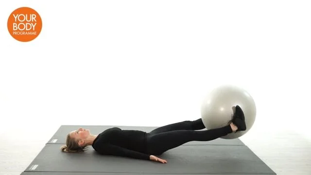 Lie on your back with your knees bent, feet on a swiss ball and arms by your side. Raise your hips then extend the legs rolling the ball away. Bend the knees and draw your feet towards your bottom, rolling the ball towards you. Lower the hips to the floor.