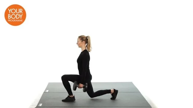 Stand feet hip width apart and hold dumbbells to your side. Lunge forwards until the back knee is just off the floor and both knees are at right angles. Keep the pelvis slightly tucked under and the body upright. Step together and repeat with the same leg.