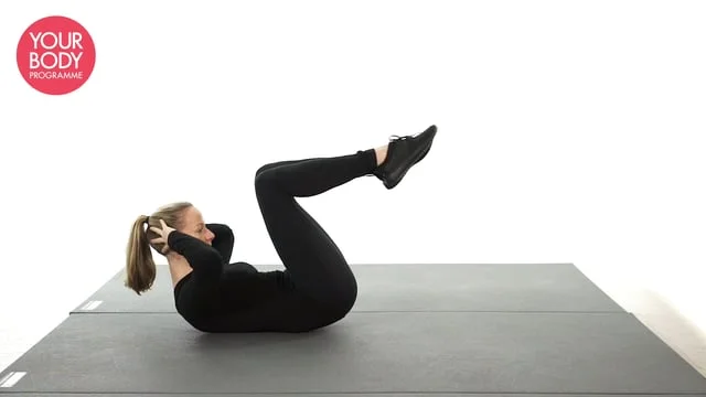 Lie on your back with your hands to head. Curl up into a crunch, keep a slight gap under the chin and simultaneously bring your knees to nose. Lower the body as you extend the legs towards the floor.