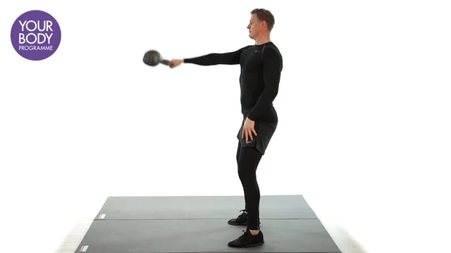 Stand feet slightly wider than shoulder width and hold a kettlebell in 1 hands. Hinge from the hips with slight knee flexion and swing the bell through the legs maintaining neutral spine, do not round the lower back. Allow the momentum to lift the bell up to shoulder height, do not lift with the arm. Alternate hands at the top of the swing, keep the core engaged.