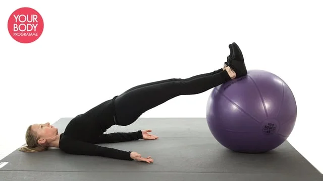 Lie on your back with your legs straight, feet on a swiss ball and hips raised. Place your arms by your side for support. Bend the knees as you roll the ball towards you, do not allow the hips to lower. Extend the legs.