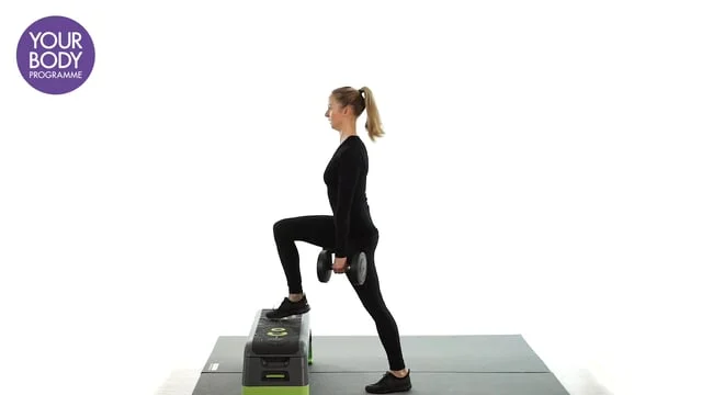 Stand feet hip width apart and hold dumbbells to your side. Lunge backwards until the back knee is just off the floor and both knees are at right angles. Keep the pelvis slightly tucked under and the body upright. Step together and repeat with the same leg.