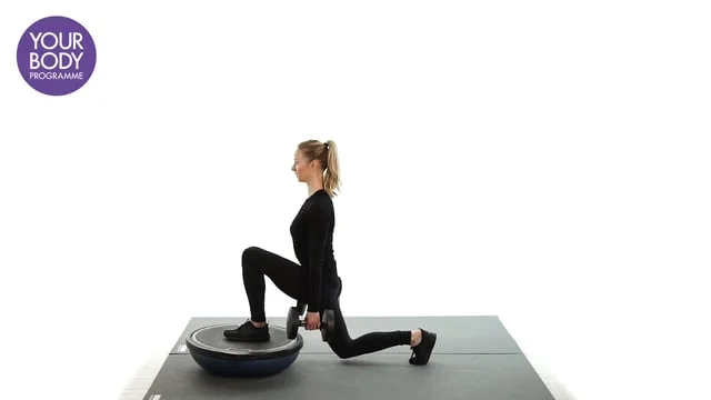 Stand in a lunge position with the front foot on a bosu (flat side up). Hold dumbbells in both hands. Lower until the back knee is just off the floor and both knees are at right angles. Keep the pelvis slightly tucked under so you do not over arch the lower back. Straightly the legs.