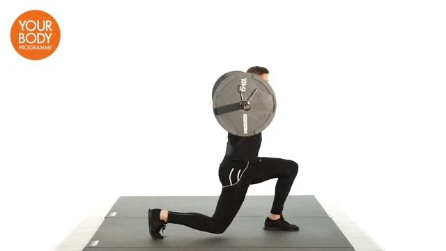 Stand with 1 foot forward and the other foot back behind you with the heel raised. Hold a barbell on your shoulders. Lower into a lunge position until the back knee is just off the floor and both knees are at right angles. Keep the pelvis slightly tucked under so you do not over arch the lower back. Straightly the legs.
