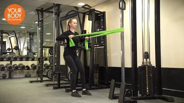 Stand in a slight squat position with your shoulders retracted, arms extended and hold the band at chest height. Pull the band towards you with your elbows slightly raised. Draw your shoulder blades down and together then extend the arms.