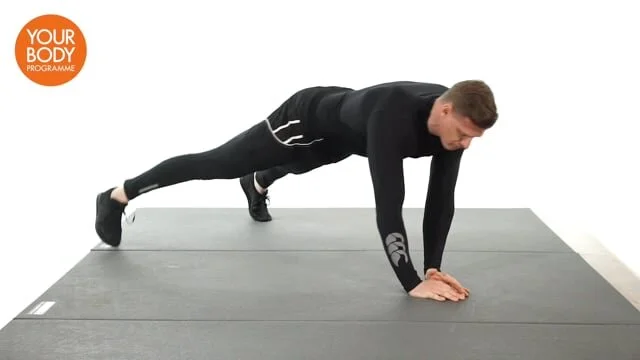 Begin in a press-up position, hands just wider than shoulder width and feet together. Perform a press-up then take 2 step laterally, using the opposite hand to leg. Repeat the press-up and reverse the lateral move.