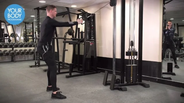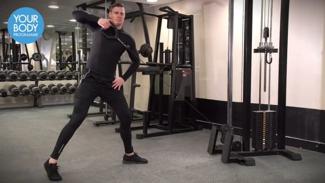 Stand facing a high cable with your feet shoulder width apart. Hold the handle in both hands with your arms extended. Engage your core and rotate the torso to 1 side, pulling the cable in a downwards motion. Return to centre with the arms raised, alternate sides.