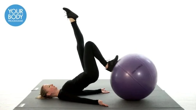 Lie on your back with 1 foot on a swiss ball (leg extended) and the other raised above you. Lift your hips and place your arms by your side for support. Bend the knee as you roll the ball towards you, do not allow the hips to lower. Extend the leg.