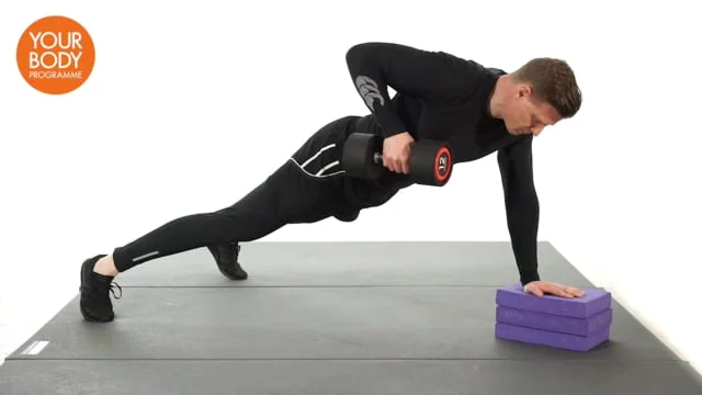 Perform a plank on 1 hand (placed onto a block) and hold a dumbbell in the other. Engage your core to maintain stability and pull into a single arm row. Make sure your wrist is placed directly under your shoulder and do not rotate the hips.