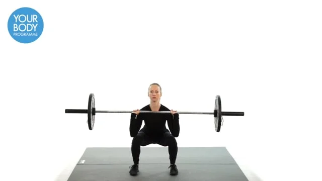 Stand feet shoulder width apart and hold a barbell to your shoulders. Bend the knees into a deep squat, push the bottom backwards and maintain neutral spine. As you straighten the legs, press the bar overhead. Make sure your knees track inline with your toes.