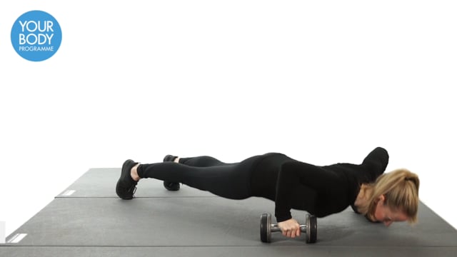 Begin in a press-up position, hands on dumbbells placed just wider than shoulder width and angled inwards slightly. Engage your core and keep your body straight. Bend the arms, elbows flared to the side slightly and lower as far as possible maintaining your position. Extend the arms.