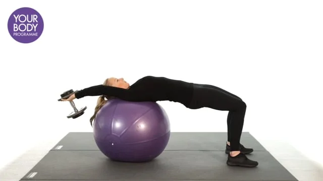 Support your head and shoulders on a swiss ball, raise your hips and hold a dumbbell above you in both hands. With slight elbow flexion, lower the weight behind you on the inhale. Keep the arms lengthened and bring the weight back over the body as you exhale. Maintain neutral spine.