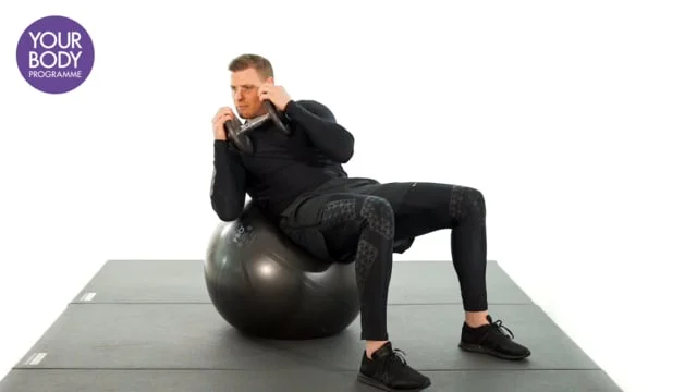 Begin with your head and shoulders on a swiss ball and hold a dumbbell overhead in both hands. Keep the arms extended as you lower the dumbbell to one side allowing the body to rotate with it. Draw it back to centre and repeat to the other side.
