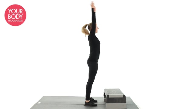 Stand facing a box with your feet hip width apart. Reach overhead then place your hands on the box and jump your legs back into a plank position with your body extended. Jump your feet back towards the box and begin again. Keep the movement as fluid as possible.