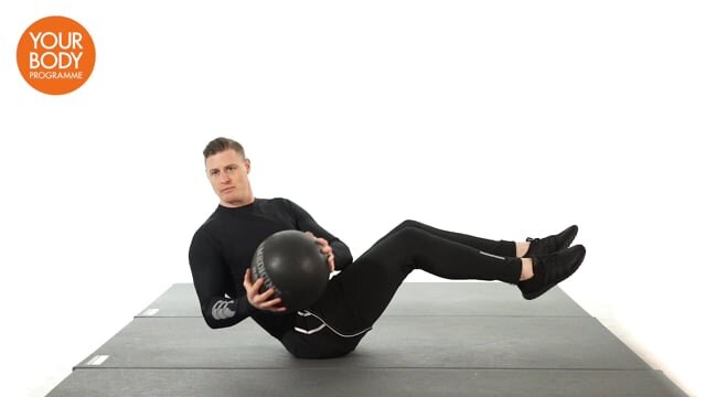 Sit upright with your knees bent then lean the body backwards and raise the feet off the floor. Hold a medicine ball in both hands with the arms slightly bent and engage the core. Rotate the torso taking the ball side to side, keep the chest lifted and navel drawn to spine.