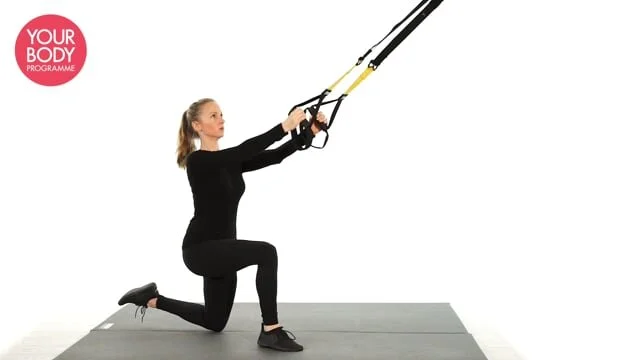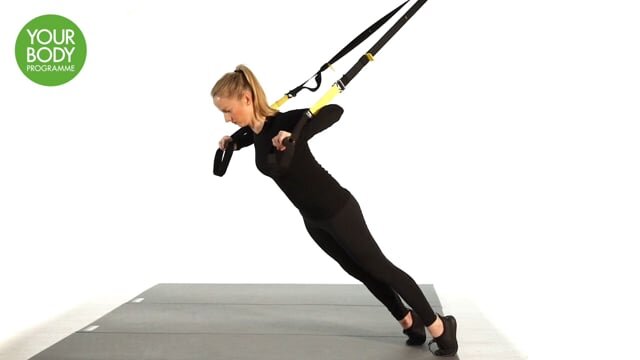Start in a press-up position with the TRX attached behind you. Take your weight onto your toes and walk your feet further underneath you to make the exercise more challenging. Maintain core stability and bend the arms lowering yourself into the press-up, keeping the hand position still, then extend the arms.
