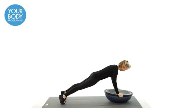 Stand with the bosu raised overhead. As you begin the exercise lower the bosu to the ground, dome side down and jump the legs back, hip width apart, into a full press-up. Jumps the legs back and raise the Bosu overhead. Try not to round the lower back.