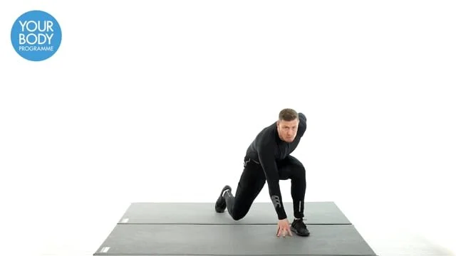 Begin with 1 foot forward in a lunge position, lean the body over the front leg and touch the floor with the opposite hand. Push through both feet and jump laterally changing legs and touch the floor with the other hand. Keep the movement continuous.
