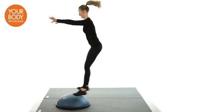Stand with your feet hip width apart. Jump onto the bosu (dome side up) and land in a squat position. Jump backwards off the bosu into a squat and begin again. Keep the movement fluid and aim to maintain neutral spine throughout.