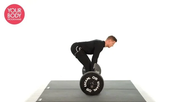Stand feet shoulder width apart, bend the knees, hinge from the hips and take hold of a barbell with a wide grip. Perform a deadlift by pressing the feet into the ground and straightening the legs. Do not let the lower back round, maintain neutral spine. Lower under control.