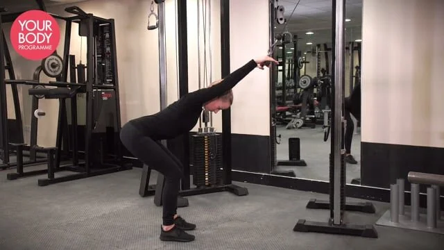 Begin in a long lunge position with the back leg extended, and hold a dumbbell in the opposite hand to front leg. Lean your torso forwards creating a straight line from head to toe. Bend the elbow and pull into a row. Keep the elbow close to the body then extend the arm.