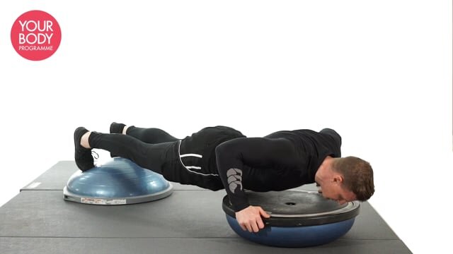 Begin in a press-up position, feet raised on a bosu (dome side up), hands just wider than shoulder width and arms extended. Engage your core and keep your body straight. Bend the arms, elbows flared to the side slightly and lower yourself until your chest is just off the floor. Extend the arms.