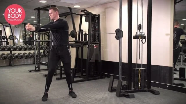 Stand side on to a chest height cable. Hold the handle in both hands and extend your arms with your shoulder retracted. Engage your core and rotate the torso, pulling the cable across the body in a smooth motion. Return under control.