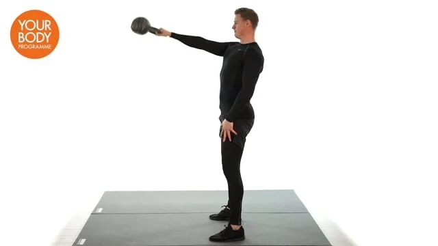 Stand feet slightly wider than shoulder width and hold a kettlebell in 1 hands. Hinge from the hips with slight knee flexion and swing the bell through the legs maintaining neutral spine, do not round the lower back. Allow the momentum to lift the bell up to shoulder height, do not lift with the arm. Keep the core engaged.