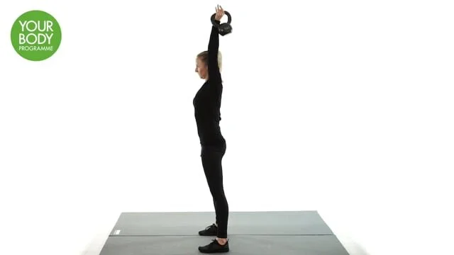 Stand with a wide stance and hold a kettlebell in 1 hand at shoulder height. Perform a deep squat and as you extend the legs, press the bell overhead. Do not over arch the lower back and keep the chest open as you lower the bell.