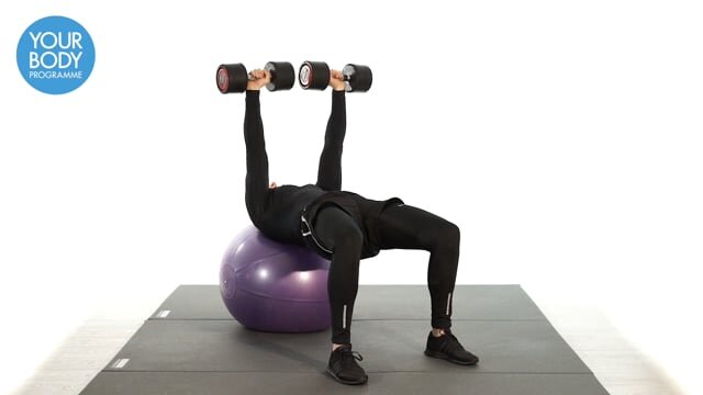 Lie with your back extended over a swiss ball and hold a dumbbell to your chest. Curl up into a crunch, keeping a slight gap under the chin and simultaneously tilt the pelvis under. Lower under control. The further back over the ball the harder the exercise.