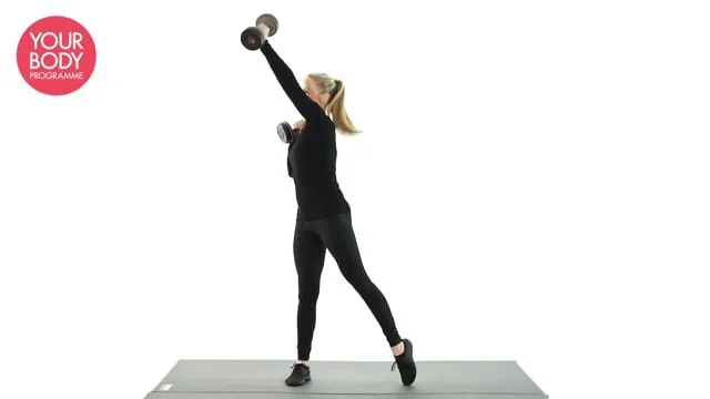 Stand feet hip width apart and hold dumbbells to your side. Lunge forwards until the back knee is just off the floor and both knees are at right angles. Keep the pelvis slightly tucked under and the body upright. Step together and repeat with the same leg.