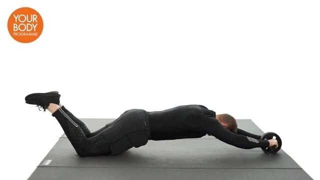 Kneel and hold onto an exercise wheel in front of you with your arms extended and hips forward. Engage your core and roll the wheel forward. Extend the arms as far forward as possible maintaining neutral spine. Draw the wheel back to the starting position.