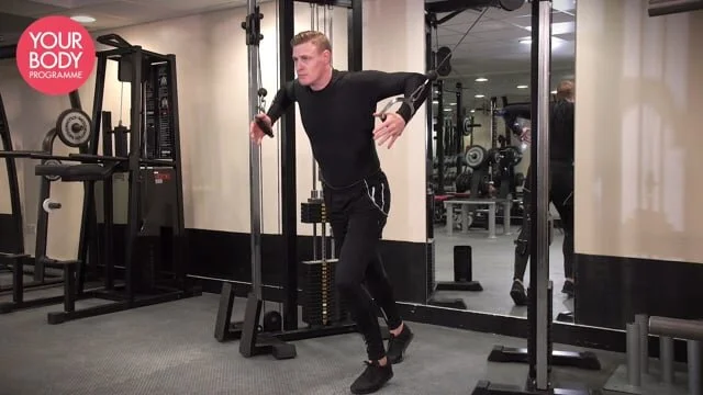 Stand in a staggered stance and take hold of high cables from either side of you. Stand slightly in front of the cables and extend the arms downwards. Bend the elbows allowing the cables to come towards your shoulders then press forward (downwards) to extend the arms.