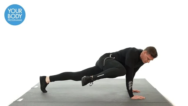Begin in a press-up position, hands just wider than shoulder width and feet together. Perform a press-up then take 2 step laterally, using the opposite hand to leg. Repeat the press-up and reverse the lateral move.