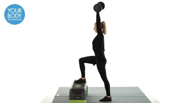 Stand with 1 foot placed on top of a box and a dumbbell held to the opposite shoulder. With the other hand hold a dumbbell to your side. Step up and lower under control. Raise the dumbbell overhead and lower back to the shoulder. Increase or lower box height to either make it harder or easier.