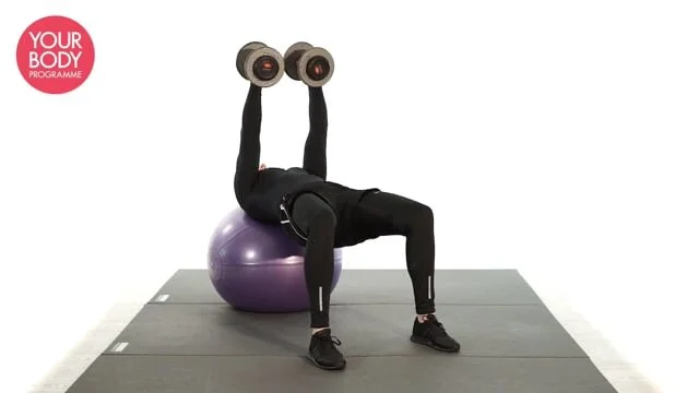 Support your head and shoulders on a swiss ball, raise your hips and squeeze your glutes. Hold the dumbbells above you with slight elbow flexion. Inhale as you open 1 arm out to the side until it is parallel with the torso. Exhale as you raise the dumbbell. Alternate sides and use your core to stabilise the body.