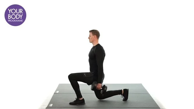 Stand feet hip width apart and hold dumbbells to your side. Alternately lunge backwards until the back knee is just off the floor and both knees are at right angles. Keep the pelvis slightly tucked under so you do not over arch the back. Keep the body in an upright position.