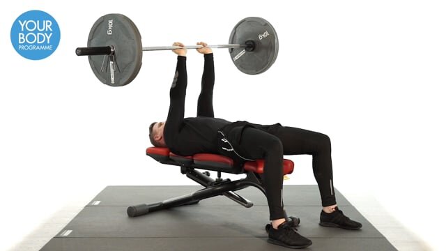Lie on a flat bench and with a narrow grip hold a barbell above. Lower the bar towards your chest keeping your elbows in close to your body and shoulders pressing down. Maintain neutral spine and push the bar away as you extend the arms.