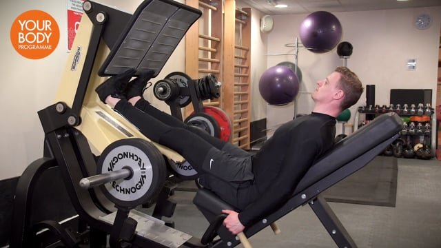 Sit upright on the leg press machine with your toes placed on the bottom of the platform. Keep the legs straight but do not lock the knees. Flex the feet bringing the toes towards you then push through the balls of the feet and press away.