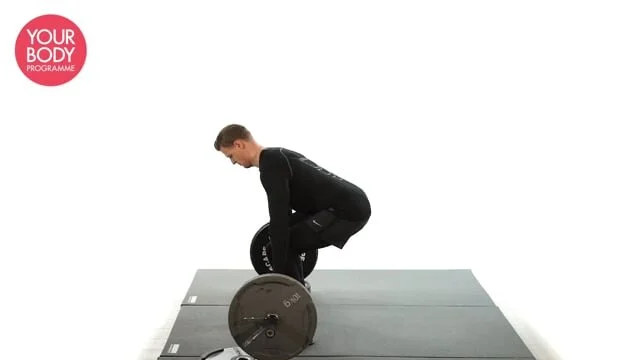 Stand feet shoulder width apart, bend the knees, hinge from the hips and take hold of a barbell with a wide grip. Perform a deadlift by pressing the feet into the ground and straightening the legs. Do not let the lower back round, maintain neutral spine. Lower under control.