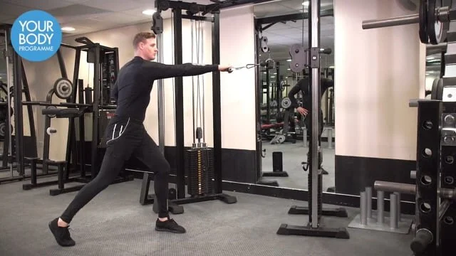 Begin in a staggered stance with the cable in 1 hand at shoulder height (opposite hand to foot forwards). Pull the cable towards you, allow the body to rotate with the movement and keep the elbow raised. Extend the arm as you rotate the body back towards the cable.