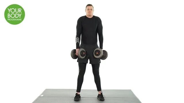 Stand upright, feet shoulder width apart and hold dumbbells to your side. With your arms fully extended raise the shoulders as far as possible, squeeze and hold for a second then lower under control.