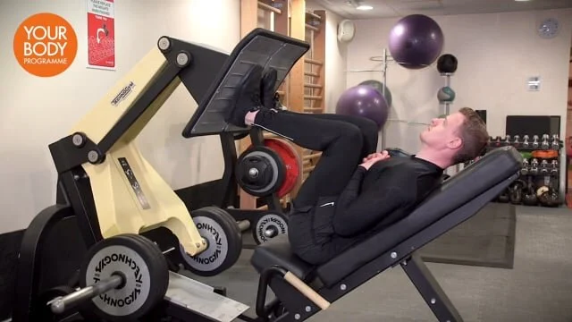 Place your feet hip width apart on a leg press machine and engage your core. Ensure the feet are in parallel and push through the heels to extend the legs, your knees should track in line with your ankles. Do not lock the knees. Lower with control.