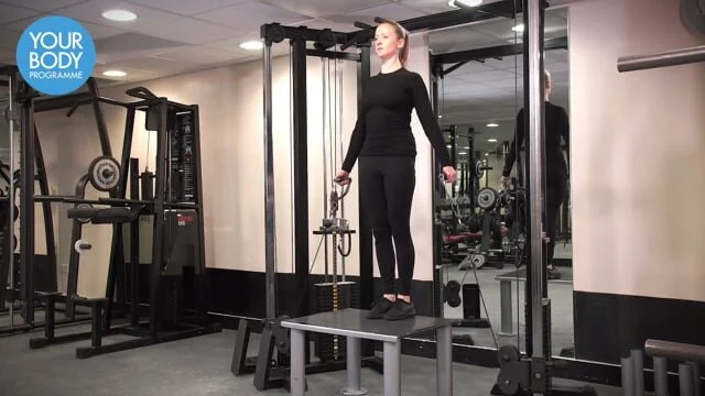 Stand holding low cables from either side of you and place a foot onto a high box or bench. Step up, alternate legs and step down. Continue the move and do not push off with the underneath leg.