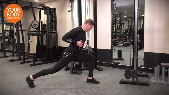 Stand in a lunge position with the back leg extended. Hold a low cable in the opposite hand to front leg and perform a single arm row. Engage the core and keep the torso forward creating a straight line from head to back foot.