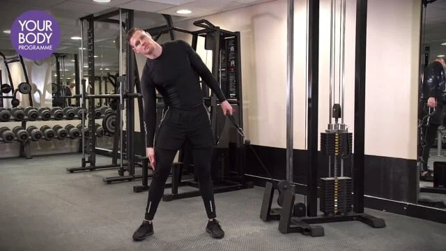 Stand side on to a low cable with your feet shoulder width apart. Take the cable in 1 hand and laterally flex the body away from the machine. Keep the hips still as you move through the centre to laterally flex towards the machine.