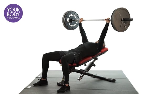 Lie on an incline bench (small incline) with your arms fully extended and the barbell pressed up in a vertical line. Lower the barbell to your chest by bending your elbows, allowing them to flare out to the sides. When the barbell touches your chest press it back to full extension.