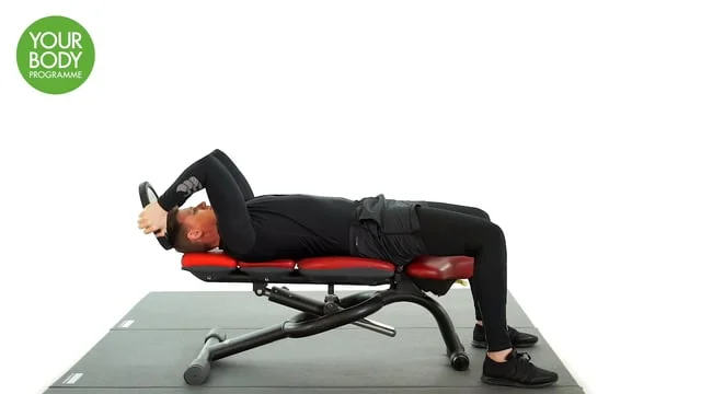 Lie on a flat bench. Hold a weight with both hands and extend the arms above you at an angle slightly past 90 degrees. Flex the elbows and lower the weight behind the head. Keep the upper arms in a fixed position, the elbows should not move or flare to the side. Extend the arms.